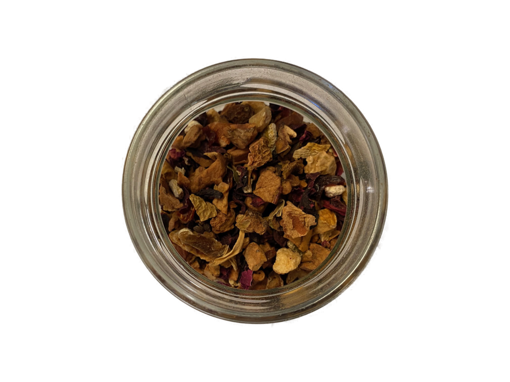 Zutaten: Apfelstücke, Hibiskusblüten, Hagebuttenschalen, Rote Bete Stücke, Apfelecken, Zitrusscheiben, Zitronenschalen, Orangenstücke, Kakaokernstücke, Orangenblütenblätter, Sonnenblumenblütenblätter, Rosenblütenblätter.