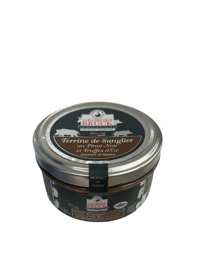 Eine mittelgrobe Terrine aus Wildschweinfleisch, Schweinefleisch und Schweineleber. Abgeschmeckt mit Elsäßer Pinot Noir und Trüffel. Gut auf frischem Brot und mit einem fruchtigem Confit.