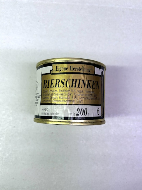 Bierschinken: 90% Schweinefleisch, Speck, Trinkwasser, Zwiebeln, Nitritpökelsalz jod.
