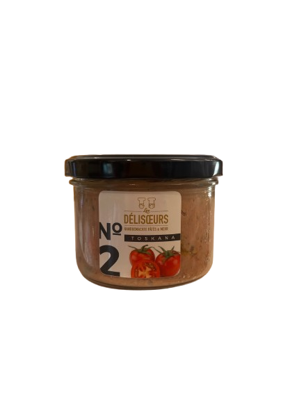 Zutaten: Schweinefleisch, Speck, Schweineleber (19 %), Milch, getrocknete Tomaten in Öl (4,7 %) (Tomaten, Sonnenblumenöl, Weinessig, Salz, Kräuter, Säuerungsmittel: Citronensäure, Antioxidationsmittel: Ascorbinsäure, natürliche Aromen), getrocknete Steinpilze (0,4 %), Nitritpökelsalz (Speisesalz, Konservierungsstoff: Natriumnitrit), Vollei, Gewürze (enthält Senf), Dextrose, Emulgator: Mono- und Diglyceride von Speisefettsäuren, Antioxidationsmittel: Ascorbinsäure.