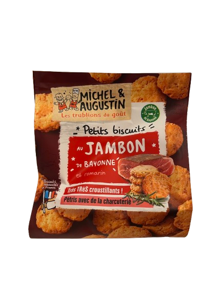 Zutaten: WEIZENMEHL 57 %, BUTTER, WEIZENSTÄRKE, gemahlener Jambon de Bayonne g.g.A. 10 % (Schweinsschinken, Salz), EIER 6,8 %*, Zwiebelpulver, Sel de Guérande 1 %, natürliches Aroma, Rosmarin 0,4 %, Backtriebmittel: Natriumcarbonate, weißer Pfeffer, Antioxidationsmittel: Rosmarinextrakt. *Eier von Hühnern aus Freilandhaltung.