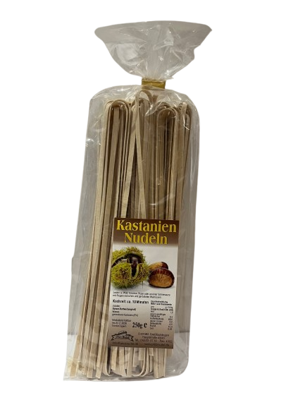 Feine Kastaniennudeln: ein besonderer Leckerbissen für den verwöhnten Gaumen z.B. zu Wildgerichten oder als Pastagericht mit einer Kastaniensauce. Diese gewalzten Nudeln erhalten durch die Herstellungstechnik eine etwas rauere Oberfläche. Dadurch nehmen die Nudeln ganz besonders gut Sauce auf.