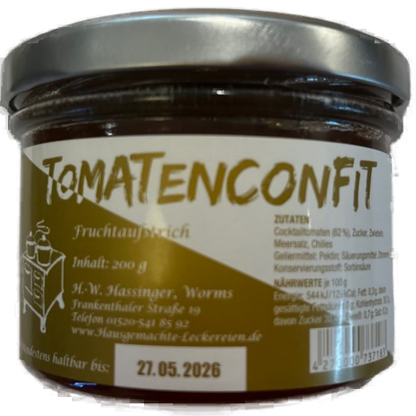 Zutaten: Cocktailtomaten 62 %, Zucker, Zwiebeln, Meersalz, Chilies, Geliermittel: Pektin, Säuerungsmittel: Zitronensäure, Konservierungsstoff: Sorbinsäure.