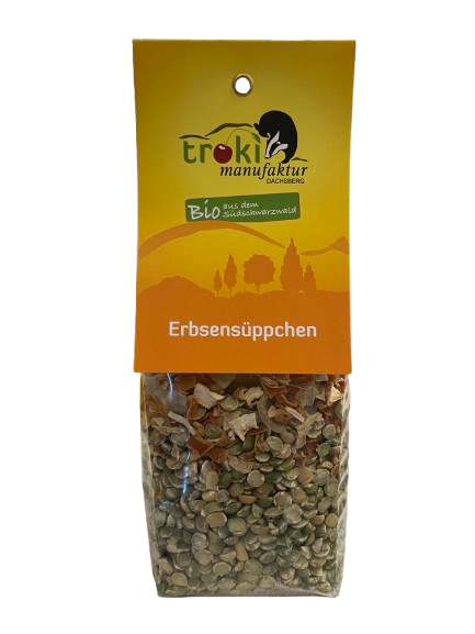 Zutaten: Grüne Erbsen* (88 %), Kartoffeln*, Möhren*, Zwiebeln*, Sellerie*, Steinsalz, Pfeffer*, Senf*. *aus kontrolliert biologischer Erzeugung