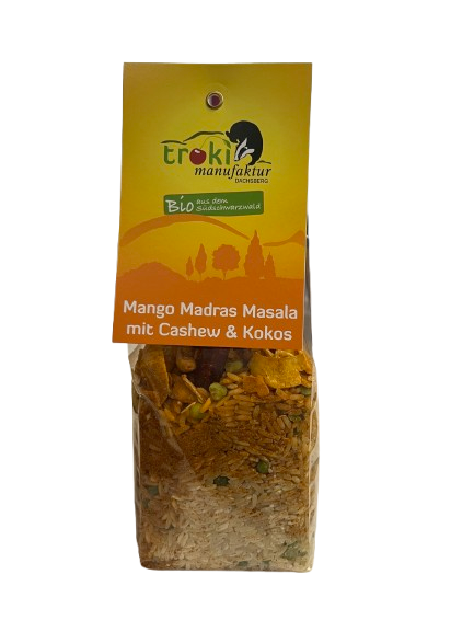 Ein Klassiker der südindischen Küche: Die Mango Reispfanne mit Cashew & Kokos abgerundet. Gewürzt mit einem fruchtig milden Madras Masala, das in der Manufaktur nach traditionellem Rezept selbst gemischt wird. Ein kulinarischer abwechslungsreicher Genuss!