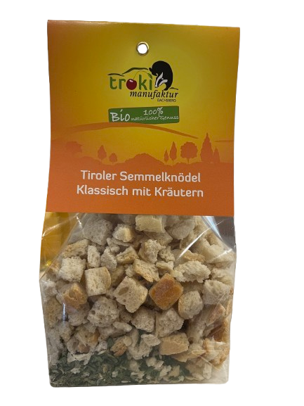 Zutaten: Semmelwürfel* (Weizenmehl*, Roggenmalzmehl*, Salz, Hefe) (90 %), Zwiebel*, Schwarzwälder Tannenrauchsalz (Bio Meersalz geräuchert in Buchen-, Tannen- & Bio Wacholderrauch), Petersilie* Schnittlauch* Majoran* (Kräuter 2,5 %), Pfeffer*. *kontrolliert biologischer Anbau