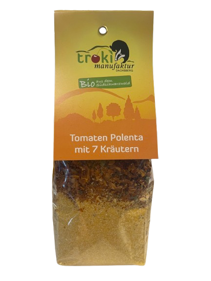 Zutaten: Mais Polenta* (90 %, Herkunft Italien), Tomaten* (6 %), Meersalz, Pfeffer*, Knoblauch*, Rosmarin*. Thymian*, Oregano*, Basilikum*, Schnittlauch*, Petersilie*, Liebstöckel*, (gesamter Kräuteranteil 1,5 %). *kontrolliert biologische Erzeugung