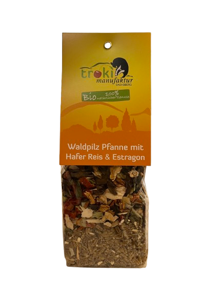 Zutaten: Hafer Reis* (79,4 % Herkunft: DE), Waldpilze* (5,7 %): (Steinpilze**, Pfifferlinge**, Herbsttrompeten**, Austernpilze*), Tomaten*, Mandeln*, Lauch*, Steinsalz, Estragon* (1,2 %), Zitrone*, Fenchel*, Pfeffer*. Alle Zutaten stammen aus kontrolliert biologischer Erzeugung* oder aus zertifiziert ökologischer Wildsammlung**.