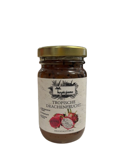 Zutaten: Zucker, 23 % Drachenfrucht, Erdbeeren, Passionsfrüchte, Glukose, Zitronensaft, Geliermittel: Pektin.