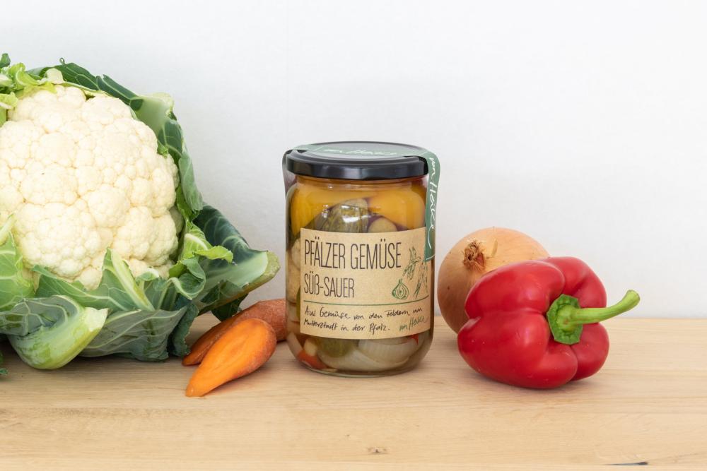 Pfälzer Gemüse süß-sauer. Abtropfgewicht: 320 g, vegan.