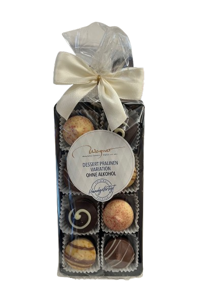 Handgefertigte Pralinenmischung mit den Sorten Schoko Mousse, Panna Cotta, Crême Brûlée und Rote Grütze.